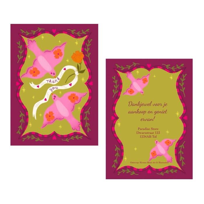 Niets is leuker dan jouw klanten een persoonlijk bedankje te geven als blijk van waardering. Een gepersonaliseerde bedankkaart is een mooie en blijvende manier om jouw waardering te tonen. Met een uniek ontwerp van Kirsten Blom geef je niet alleen een persoonlijke boodschap, maar ook een prachtig aandenken aan jouw merk of winkel.
