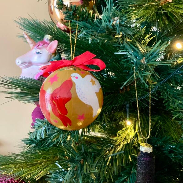 Deze kleurrijke kerstbal van papier-maché is met de hand beschilderd door Kirsten met een decoratie van twee witte vredesduiven die een rode strik vasthouden op een okergele achtergrond met felroze sterren. Na het beschilderen is de bal afgelakt met een glanzende acryllak. Van deze kerstbal is er maar eentje gemaakt en dus uniek!