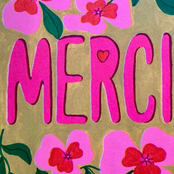 Merci! Een bedankje sturen is natuurlijk al leuk, maar helemaal met deze leuke kaart met de tekst Merci! Deze kaart heeft roze met rode bloemen en een roze tekst.