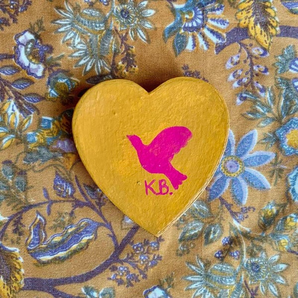 Deze waxinelichthouder is okergeel geschilderd en gedecoreerd met geelgouden sterren, roze slangen, rode harten en groene bladeren met paarse bloemen. Op de zijkant zijn rode hartjes en groene bladeren met paarse bloemen beschilderd. Op de achterkant is een vliegende vogel geschilderd met de initialen van de maker: Kirsten Blom. De houder is afgelakt met glanzende acryllak. Van deze waxinelichthouder is er maar één.