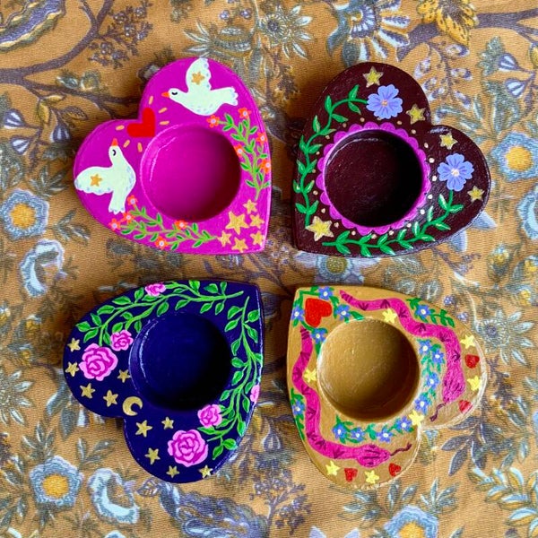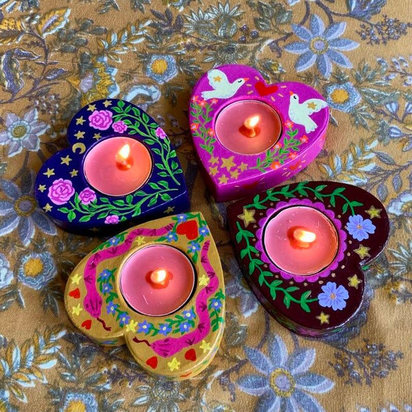 Kirsten heeft deze waxinelichthouder in de vorm van een hart met veel liefde en oog voor detail beschilderd. De houder is gemaakt van papier machée. Dit is een heel stevig, maar lichtgewicht materiaal wat heel geschikt is om te decoreren.