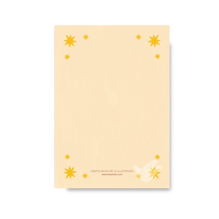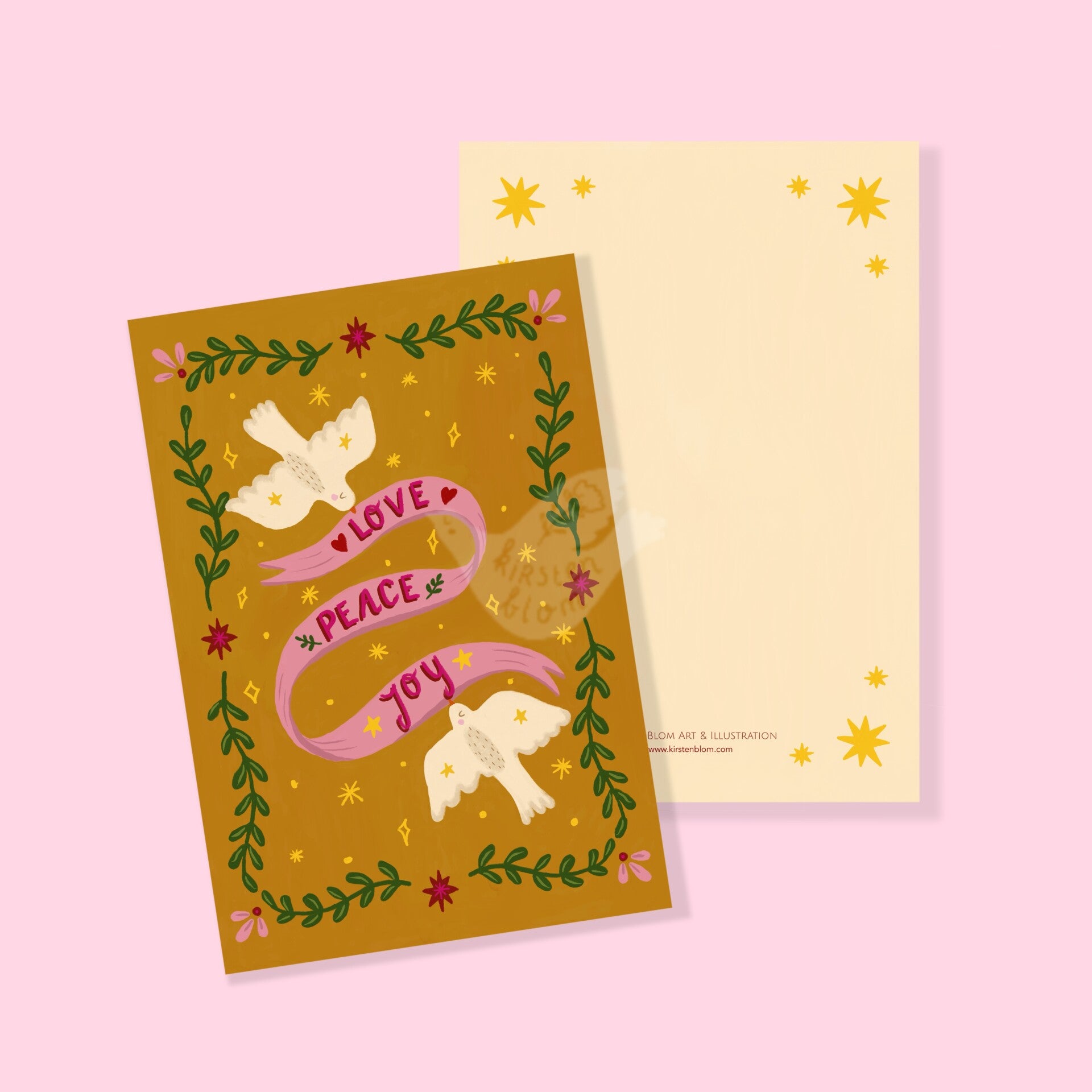 Laat de feestdagen sprankelen met deze kleurrijke kerstkaart waarop twee vredesduiven een roze banner vasthouden met de hartverwarmende boodschap: Love, peace and joy. Deze geïllustreerde kerstkaart is ontworpen door illustrator Kirsten Blom en straalt positiviteit, zachtheid en feestelijkheid uit.