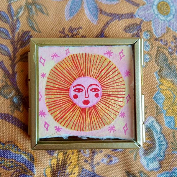 Dit mini kunstwerkje van een stralende zon op handgeschept papier is ingelijst in een klein goudkleurig lijstje met glas aan beide kanten.